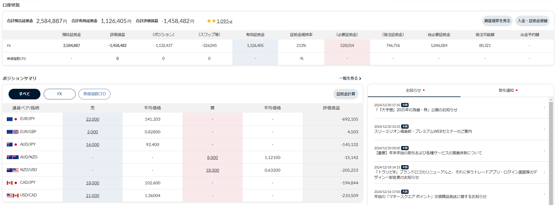 説明用なので2023年時のスクショですが、口座状況の(スワップ)に表示されている『-3,351,020円』が1年間かけて蓄積されたスワップです。
