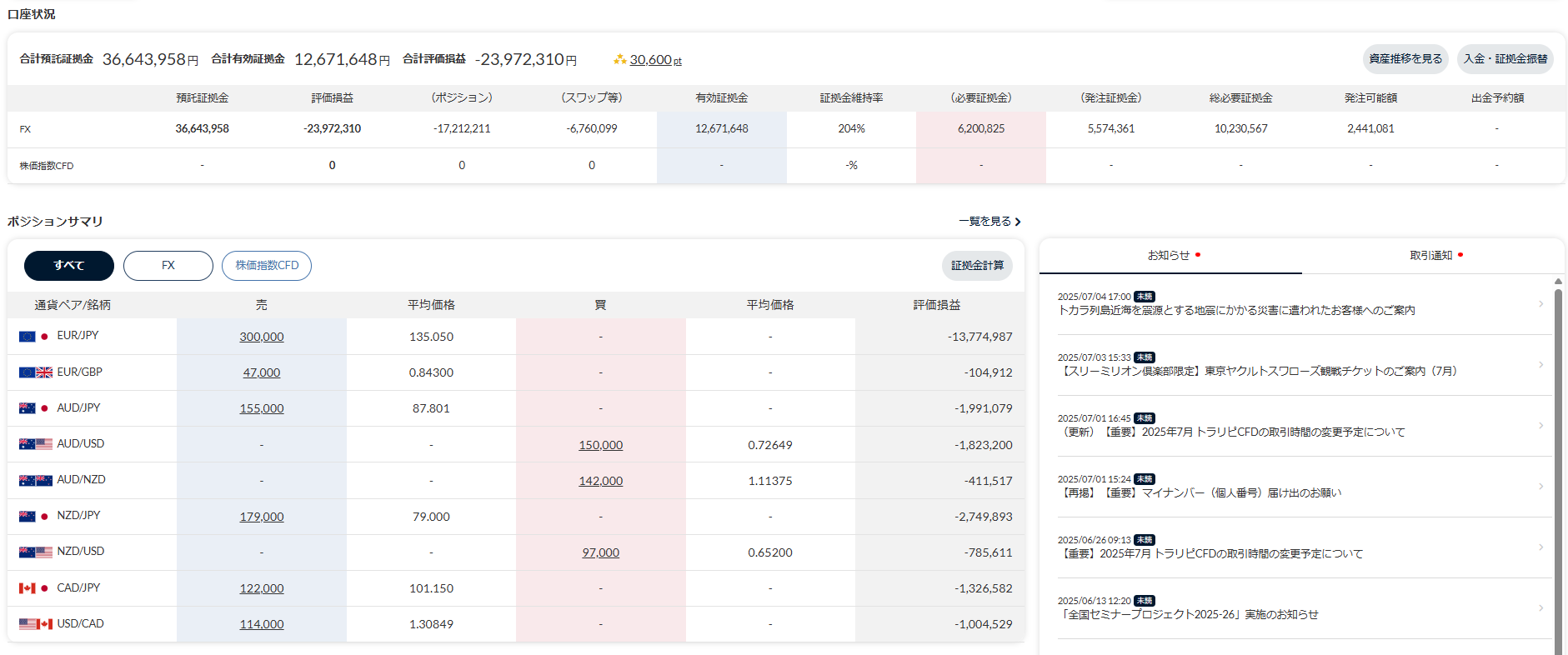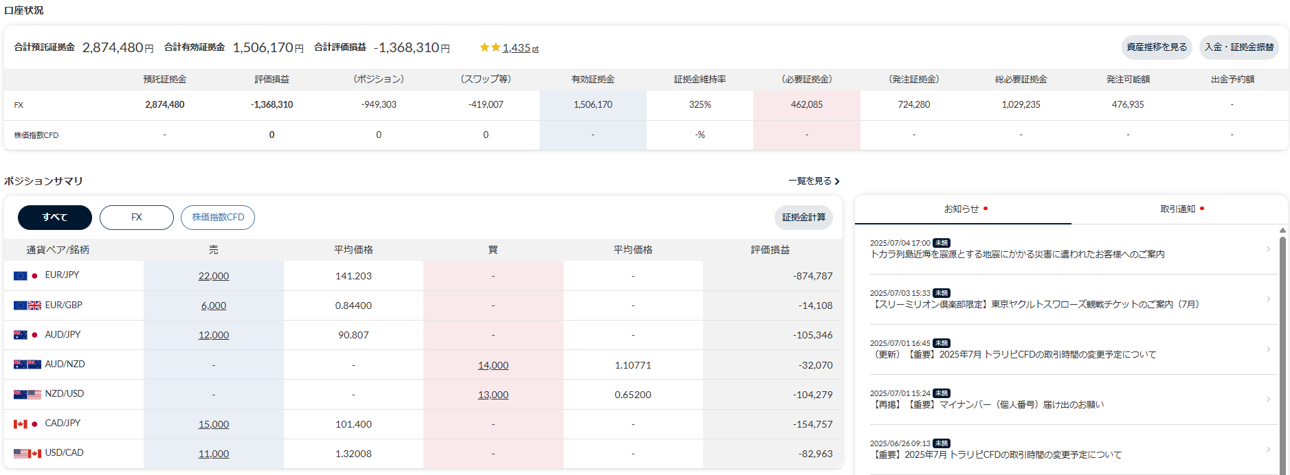 説明用なので2023年時のスクショですが、口座状況の(スワップ)に表示されている『-3,351,020円』が1年間かけて蓄積されたスワップです。