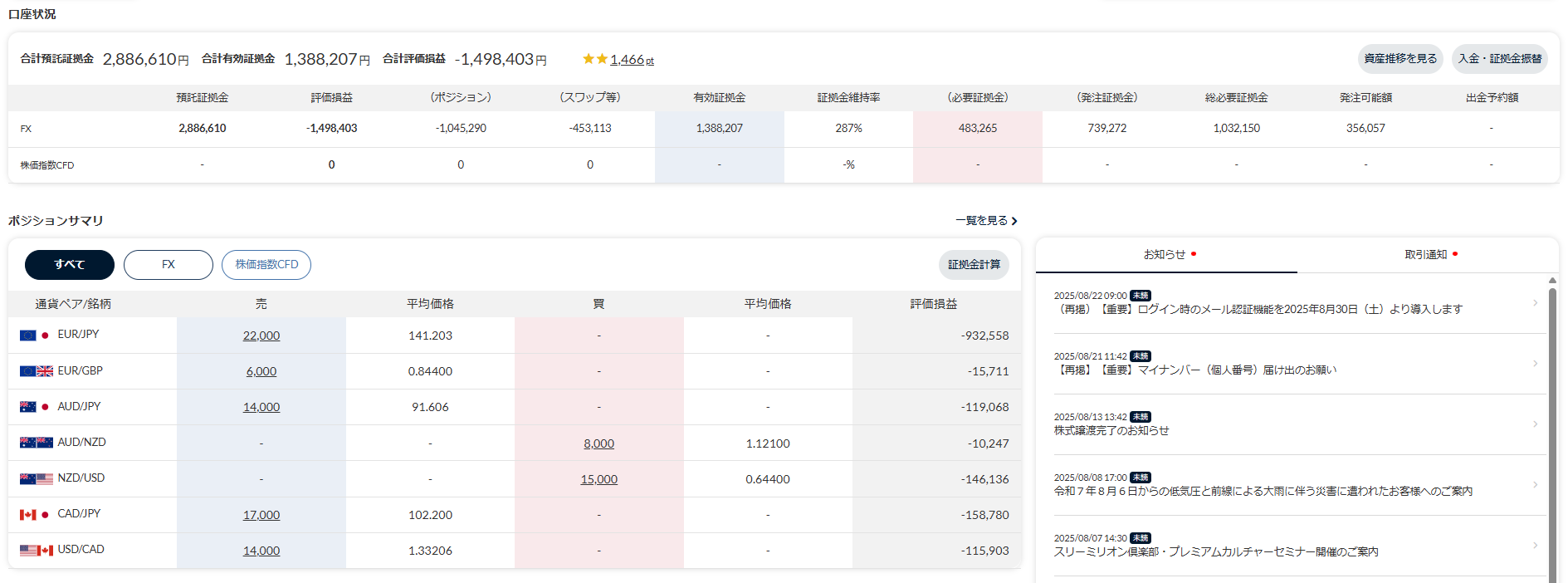 説明用なので2023年時のスクショですが、口座状況の(スワップ)に表示されている『-3,351,020円』が1年間かけて蓄積されたスワップです。