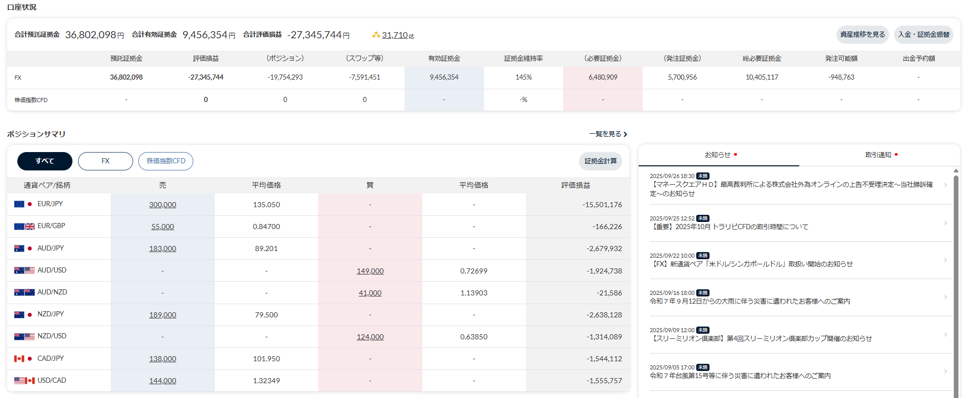 説明用なので2023年時のスクショですが、口座状況の(スワップ)に表示されている『-3,351,020円』が1年間かけて蓄積されたスワップです。