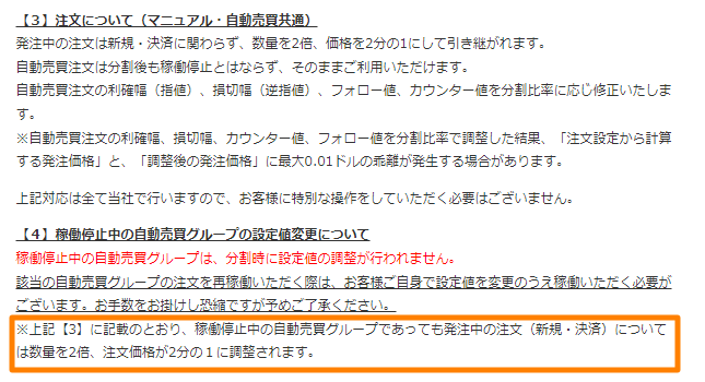 ※上記【3】に記載のとおり、稼働停止中の自動売買グループであっても発注中の注文(新規・決済)については数量を2倍、注文価格が2分の1に調整されます。
