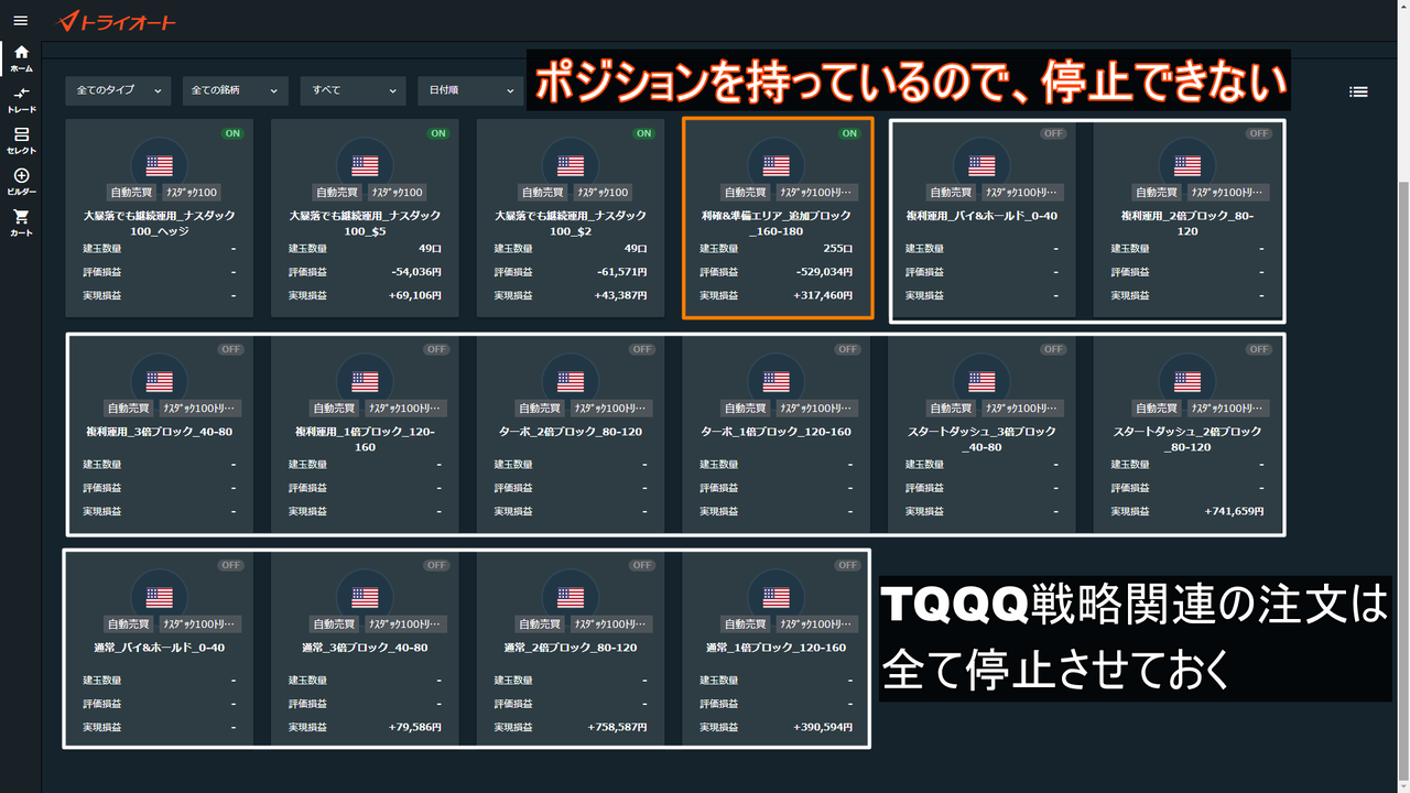 まず前提ですが、TQQQの自動売買は新規稼働を停止しています。
