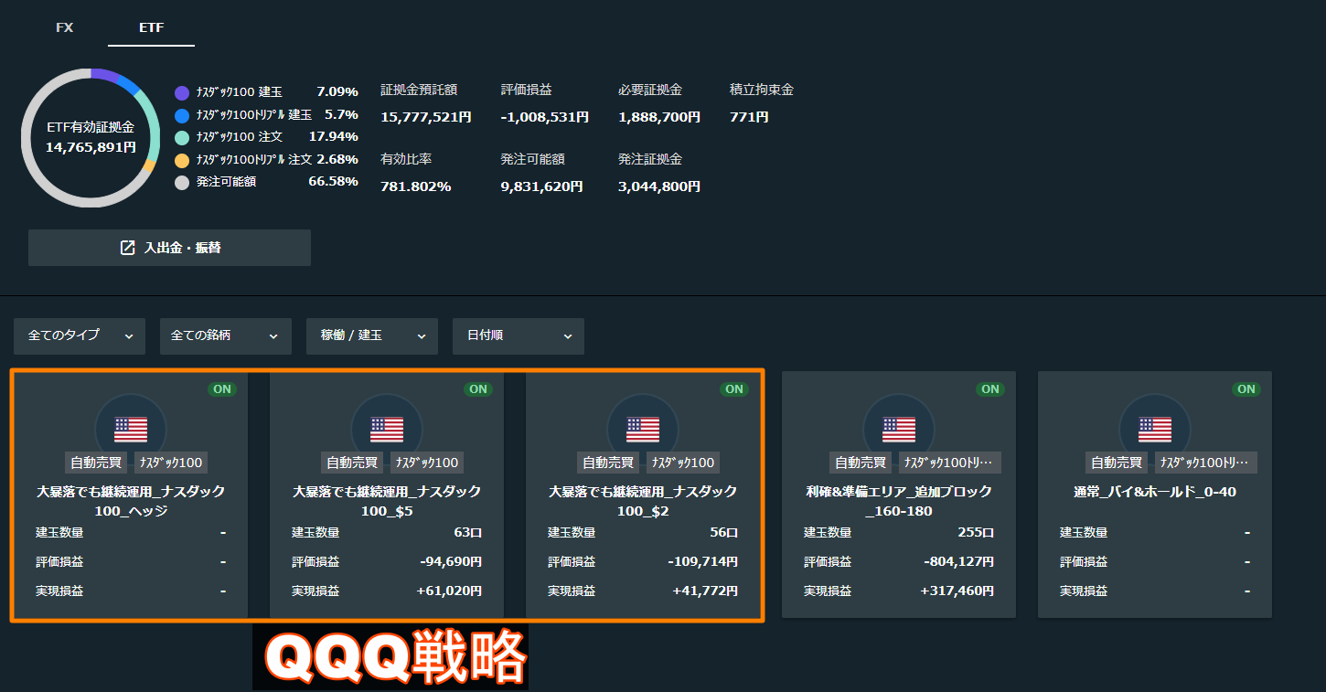 その後TQQQが上昇し、TQQQ戦略のポジションが決済されたら、その資金もQQQ戦略に回すといいと思います。