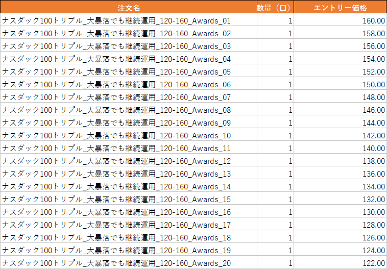 - 分割前:0ドル~160ドルまで注文を敷きつめる(1口)