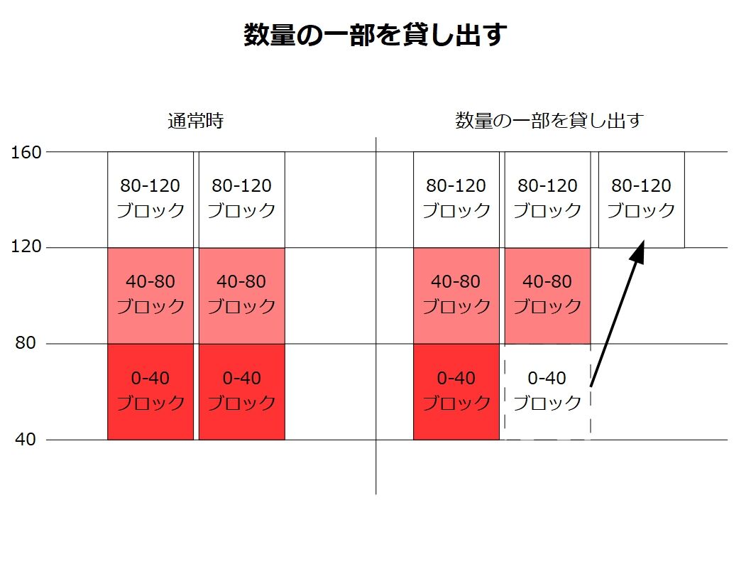 そこで、一つ下のブロックは貸し出さないこととし、80-120ブロックまで上昇した場合にのみ0-40ブロックだけ貸し出すなどのバリエーションが考えられます。