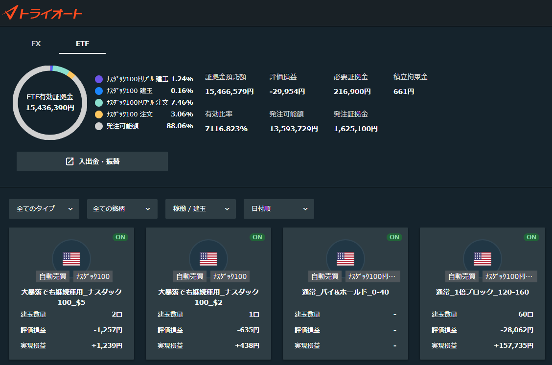 ナスダック100トリプルは長期的には右肩上がりの指数なので、ロスカットさえさせなければ利益が積み重なると考えて、積極的に運用中です!!