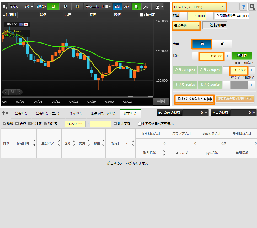 連続予約注文は入力方法が複雑なので、例として138円売り⇒137円買いの連続予約注文を入力してみます。