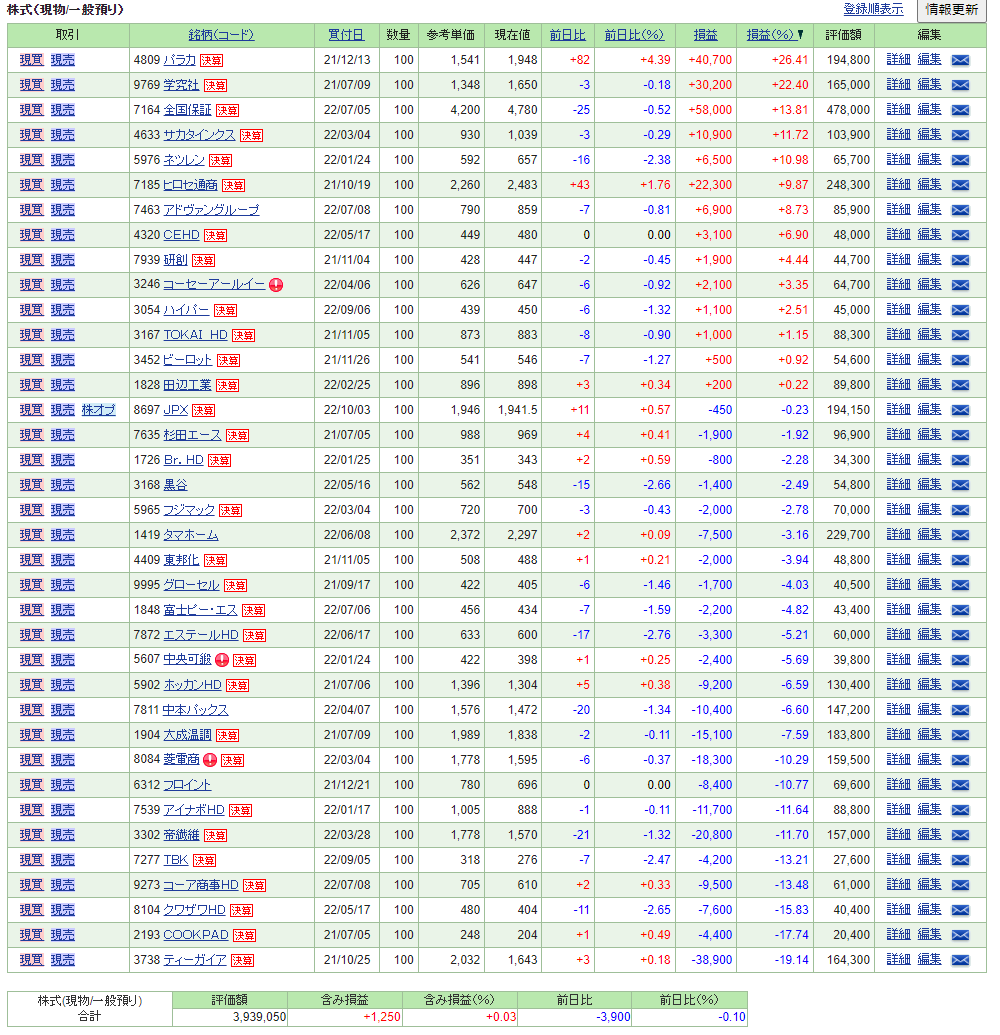 理想は上昇傾向なんですが、この手法の目的は値上がり益ではなく優待と配当で生活することなので、上昇には拘りません。