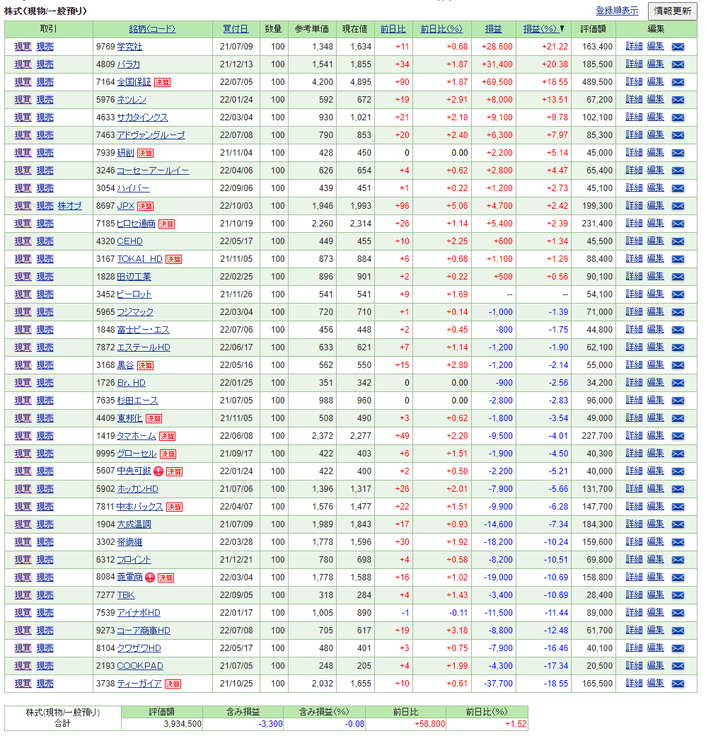 | 優待株 | 0円 | 68,698円 | -3,300円 |